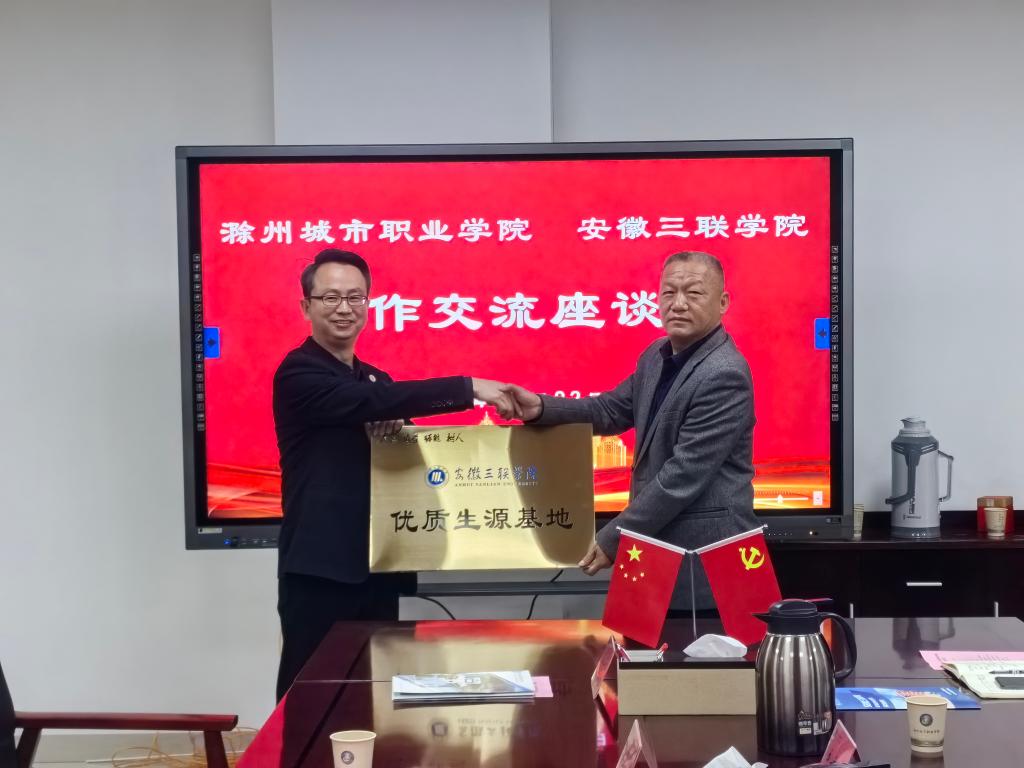 与会双方就产业学院建设、人才培养输送等方面进行了充分交流和深入探讨。活动期间,安徽三联学院为我校授予“优质生源基地”铭牌。