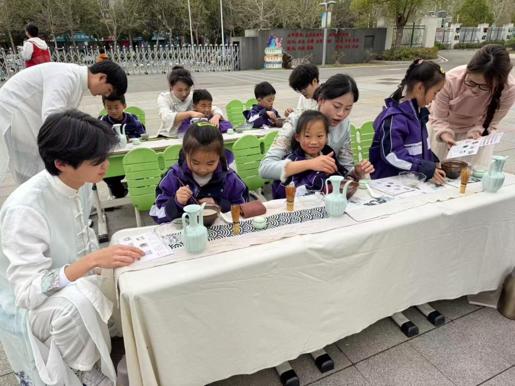 本次活动由学院高菲老师、叶媛媛老师担任总策划,精心设计“投壶雅趣、宋代点茶、香包手作、漆扇绘韵、活字印刷、古法造纸、植物拓染”七大非遗体验项目,通过“体验集章兑奖”和“非遗知识挑战”机制,激发学生探索热情。仿宋点茶项目特邀江淮技能大师许方媛现场指导,还原宋代茶道雅韵,讲述茶文化与滁州的历史渊源,学生在志愿者的引导下,体验茶筅击拂、茶汤点制等传统技艺;亲手制作艾草香包,感悟中医药文化“驱邪避疫”的智慧;体验活字印刷与古法造纸,从蔡伦的创新故事中汲取奋进力量;通过植物拓染实践,领悟环保理念与传统技艺的融合,志愿者们细致讲解各项非遗技艺的历史渊源和文化底蕴,将工匠精神与家国情怀融入实践教育,潜移默化中厚植学生的文化认同与社会责任感。永乐小学教师表示:“活动不仅让孩子们感受到传统文化的魅力,更在协作中培养了团队精神,是一堂生动的思政实践课。”