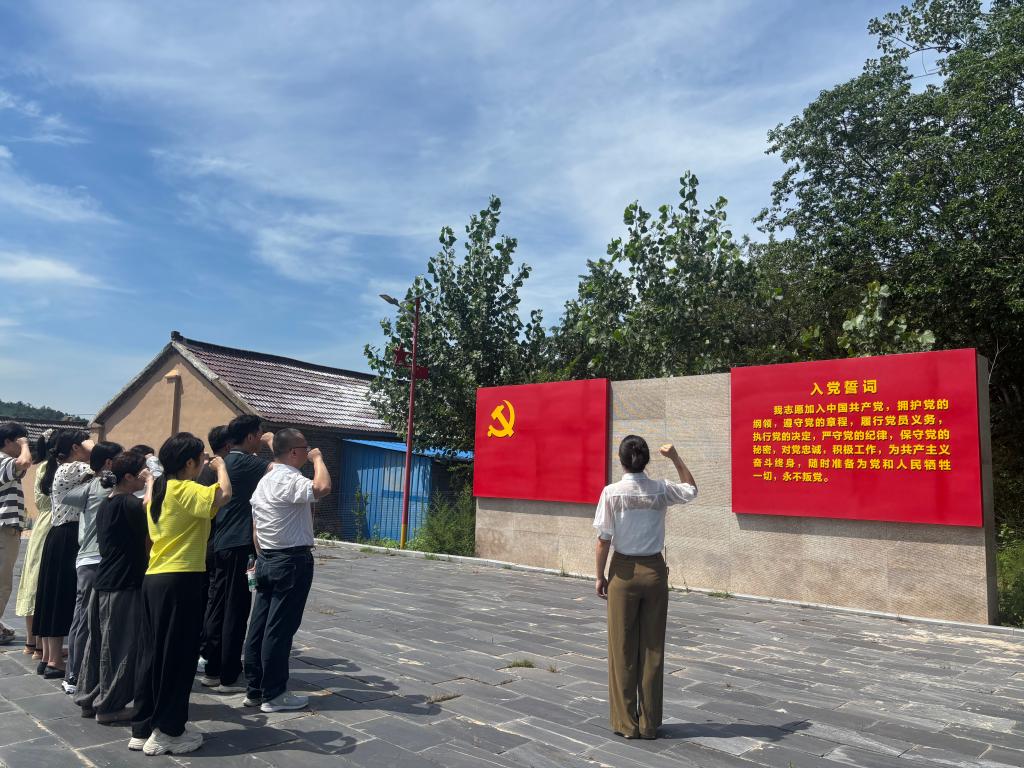 在庄严肃穆的皇甫烈士陵园,全体党员整齐列队,向为革命事业英勇献身的人民英雄默哀致敬,深切缅怀先烈们的丰功伟绩。随后,大家前往中共中原局会议史料陈列馆参观学习,通过珍贵的历史图片、文献和实物,重温抗战时期中共苏皖省委领导军民团结抗战的光辉历程,深刻感悟共产党人坚定的理想信念和崇高的革命精神。特别是当时的边区政府提倡勤俭节约,严禁大吃大喝,铺张浪费的有关规定让所有党员都体会了中国共产党抓作风建设的一以贯之。活动中,党总支副书记张晓慧带领全体党员面向党旗,高举右拳,重温入党誓词。“我志愿加入中国共产党……”铿锵有力的誓言回荡在红色教育基地,表达了全体党员对党的无限忠诚和为教育事业奋斗终身的坚定决心。