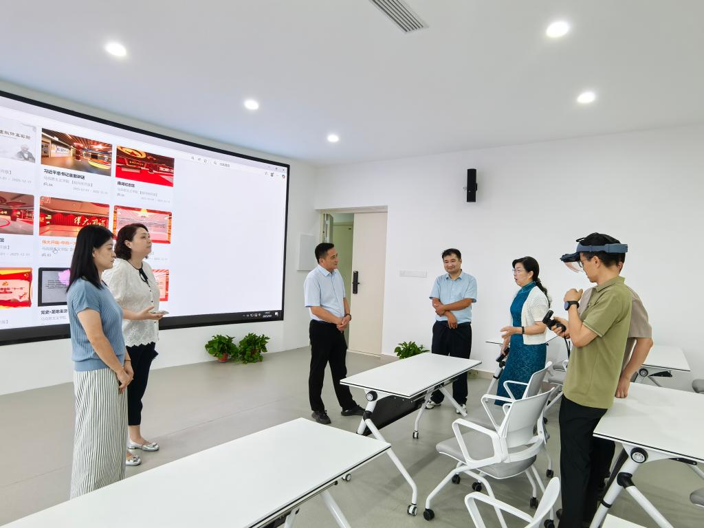 来访团队首先参观了我校智慧思政研修基地,该基地依托虚拟现实(VR)、开放式虚拟仿真实训教学管理平台、3D 沉浸式思政教学系统等前沿技术,构建了“理论学习-场景实践-效果评估”全链条数字化育人平台。在讲解员的引导下,吉晓华一行共同体验了“红色VR课堂”“MR思政交互系统”“智慧沙盘”等创新形式,沉浸式体验了前沿数智化技术的教学应用。