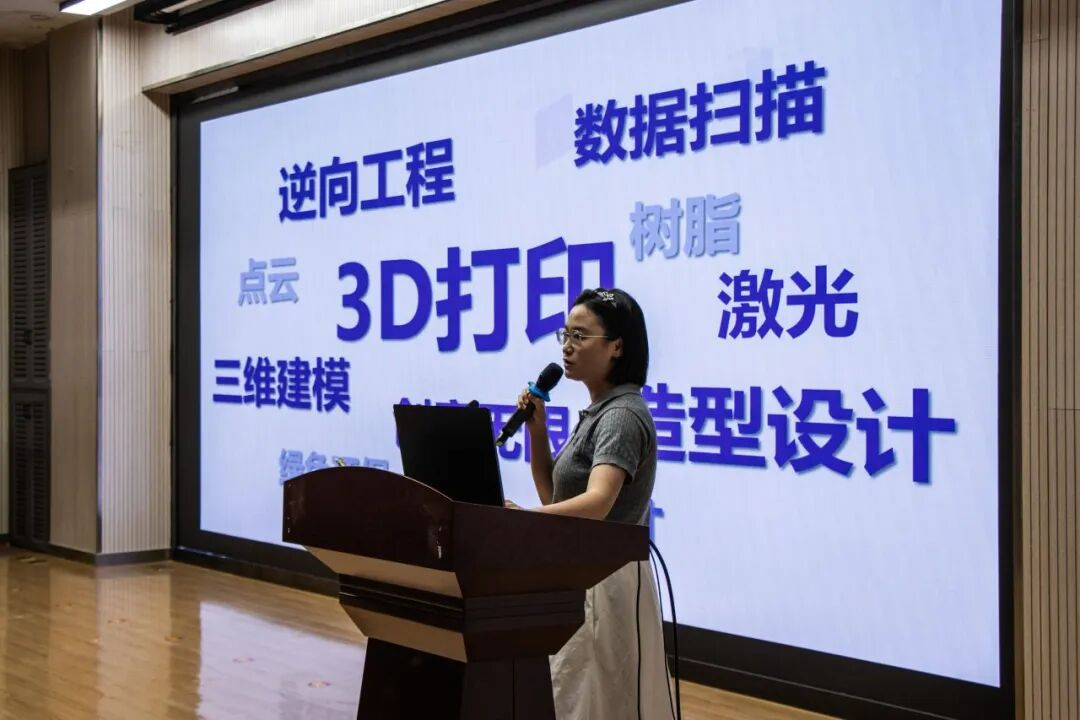 3D打印增材制造微课程负责人樊瑾老师,携带打印模型,讲解建模、设备操作等要点,展现“科技+艺术”特色。