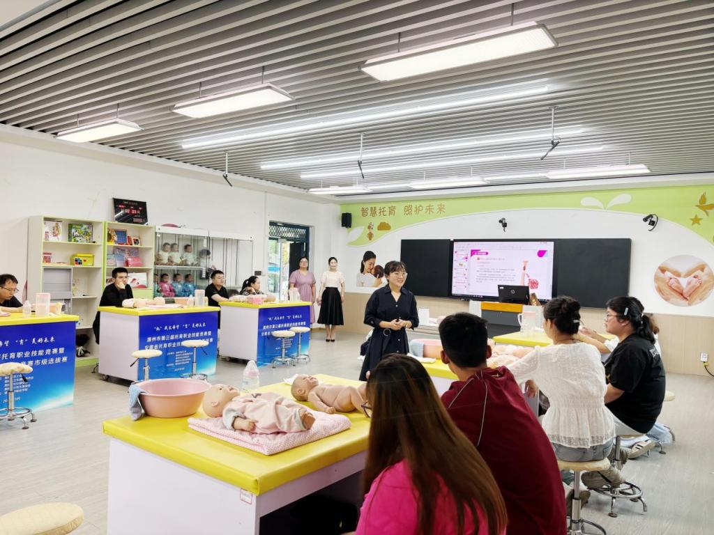 实操培训环节氛围热烈,婴幼儿托育服务与管理专业负责人戴月琦老师以模拟婴儿模型演示生活照料技巧,如喂奶、婴儿包裹的季节松紧要求,以及日常保健如抚触手法、力度与顺序,并演示了急救技术海姆立克法和心肺复苏,她邀请参与者动手实践,逐一指导并纠正动作,解答疑问,参与者积极互动。