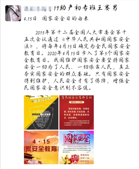 另外,各班级同学还通过微信、微博等对国家安全日进行了广泛宣传,使国家安全的相关知识被更多人所知,共同维护国家的安全。