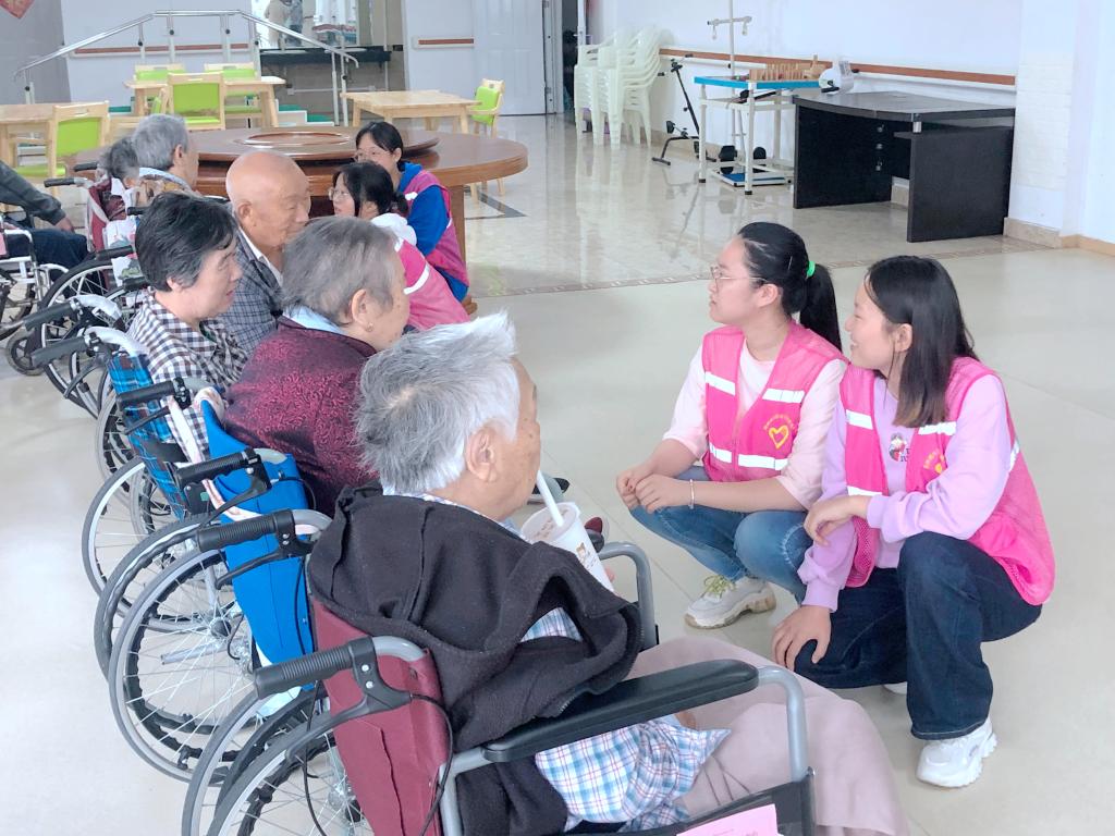 志愿者们与老人亲切交谈,详细了解老人身体、生活、饮食等情况,通过拉家常的方式,志愿者逐渐拉进了与老人们的距离,老人也渐渐敞开了心扉,与志愿者们攀谈了起来。此外,志愿者们还给老人放松身体、给老人讲故事、唱歌、小游戏等,现场充满了欢声笑语。一个个小小的身躯,奉献着大大的志愿力量,为老人们送去祝福送去温暖。